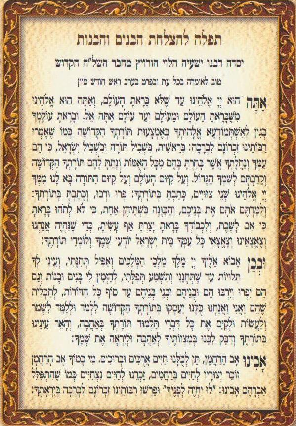 Je prie donc que mes enfants et mes descendants soient dépourvus de tout défaut mais qu’au contraire, ils représentent paix, vérité, bien et droiture aux yeux d’Hachem et des hommes. Puissent-ils être des érudits en Torah instruits en l'Ecriture, la Michna, le Talmud et la Kabbala : qu'ils soient exemplaires dans l'accomplissement des Commandements, dans la bienfaisance et les vertus. Puissent-ils Te servir avec amour et une crainte authentique et non affectée. Accorde à chacun d'eux ses besoins de façon honorable ainsi que la santé, la dignité et la force. Octroie-leur une haute stature, la beauté, la grâce et la faveur. Que l’amour, la bonne entente et la paix règnent parmi eux, Donne-leur de bons époux, nés d'érudits et de justes, et dotés des qualités que j'ai sollicitées pour mes enfants.