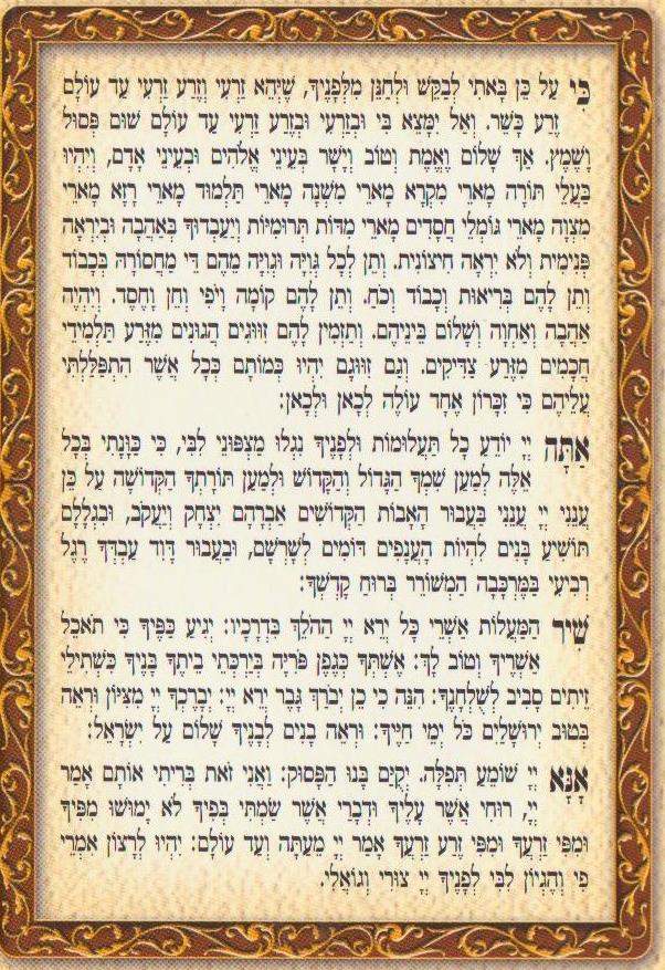 Aussi, ô Hachem, Rois des rois, je viens présenter ma requête devant Toi! Mes yeux sont tournés vers Toi dans l'espoir que Tu écoutes ma prière avec grâce et que Tu me donnes des fils et des filles. Puissent-ils, eux aussi, croitre et se multiplier jusqu’aux dernières générations afin qu'eux, moi et nous tous, nous nous adonnions à Ta sainte Torah pour étudier, enseigner, observer et accomplir toutes les paroles de Ta Torah avec amour. Fais nous comprendre Ta Torah et attire notre cœur vers Tes commandements pour atteindre l'amour et la crainte de Ton Saint Nom.