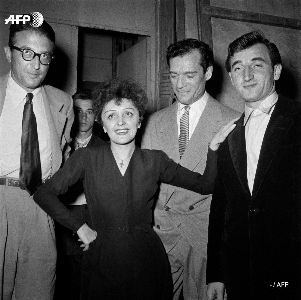 - Edith Piaf entourée du compositeur Michel Emer, de l'acteur Eddie Constantine & de Charles Aznavour en 1950 in Paris #AFP